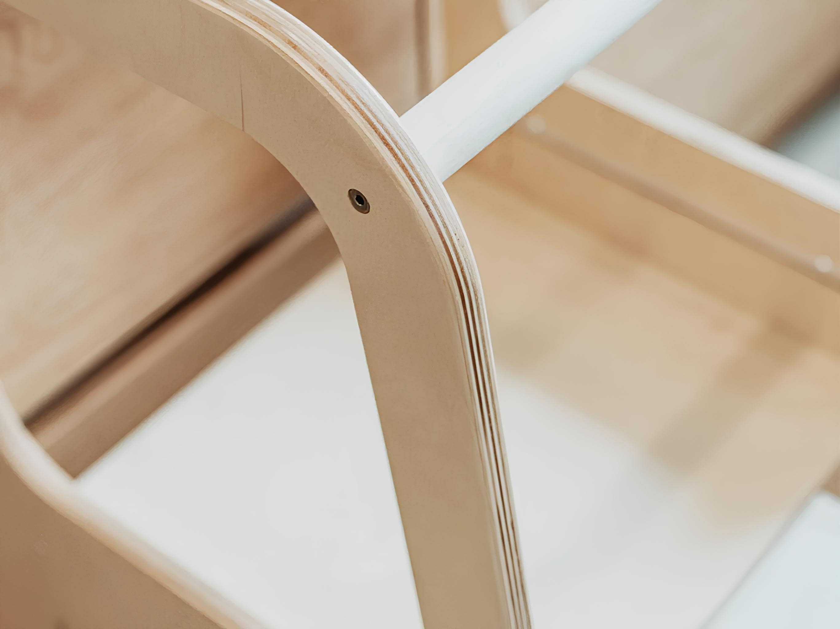Notre penderie Montessori est soigneusement conçue en contreplaqué de bouleau de la Baltique, un bois naturel reconnu pour sa robustesse et sa longévité. Ce matériau est constitué de plusieurs couches de placage de bouleau, collées avec un adhésif respectueux de l’environnement, ce qui garantit une solidité exceptionnelle.